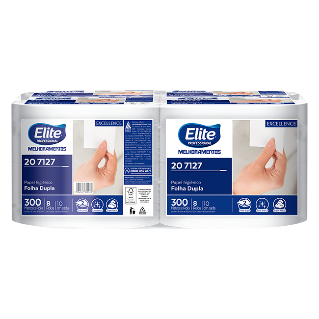Quando falamos de Elite Professional, você está diante de toda tradição e qualidade da Melhoramentos, só que ainda mais ELITE. Com soluções profissionais de higiene para o seu negócio. O Papel Higiênico EXCELLENCE em rolo folha dupla possui coloração extra branca, maior resistência, maciez e super absorção. Foi desenvolvido para quem busca um produto premium de alta performance e máxima qualidade aliado a rendimento. Rendimento: Sua embalagem possui 8 rolos de 300 metros cada. Trazendo redução de tempo dedicado ao abastecimento. É indicado para toaletes em geral, especialmente para locais de alto fluxo, por exemplo: Aeroportos, shoppings, hospitais, bares e restaurantes, cinemas, escolas, dentre outras. Possui o selo de qualidade ISO 9001 e origem responsável FSC®